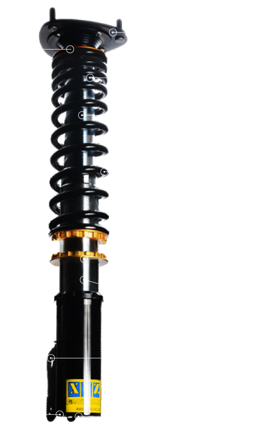 Long stroke and long spring which enable to absorb chassis vibration, aggressively attack from high speed bouncy road and bear extremely G-force when turning.