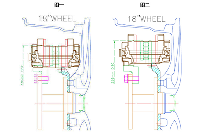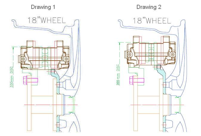 In case your rim is for 18 inch, it’s a wrong decision if the rotor size you choose for front brake kit is 355mm, and rear brake kit for 330mm. In our brake design, you are supposed to choose the same rotor size for front and rear brake kit, it’s because we have settle on the ratio for front and rear brake pads.If you choose bigger rotor size in front brake kit but with smaller rotor size for rear, such as Front: 355mm/Rear: 330mm, consequently, the brake will be out of balance easily, and it will be dangerous if you brake suddenly.If short, if the rim you have is 18 inch, then you must choose Front and Rear 355mm brake kit, and please don’t really think that smaller rotor size isn’t likely to touch the rim. It’s certainly a wrong decision as it’s easier to interfere with the wheel and more dangerous. Please see drawing 1 and 2.